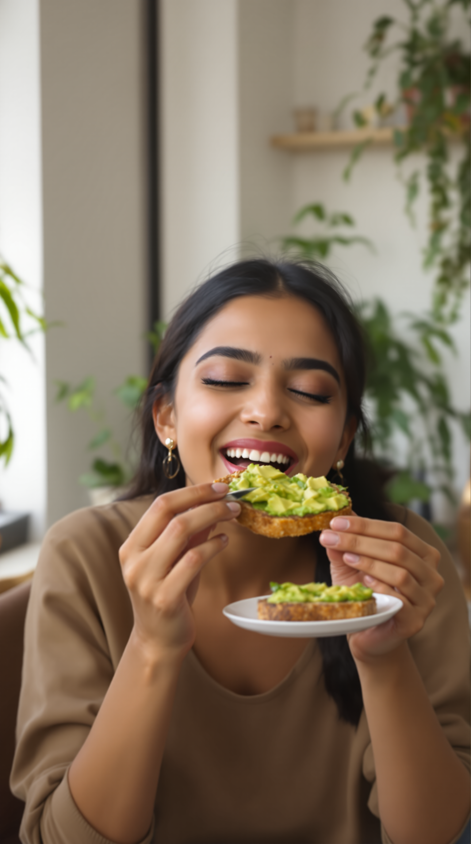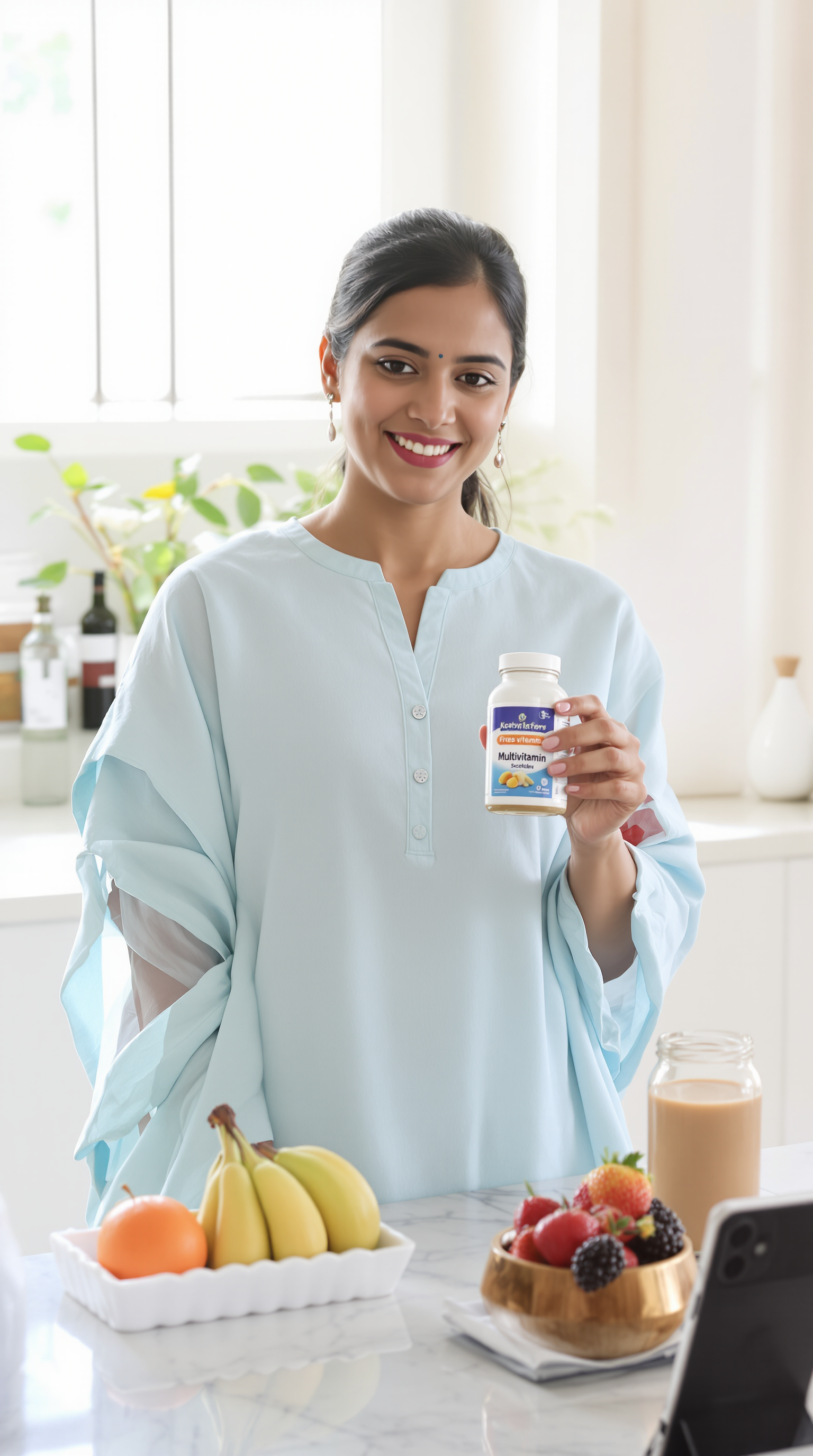 No templates, no forms. Just type what you want: "A woman holding my vitamin C serum, recommending it to camera in her bathroom." You can also upload your product photo.