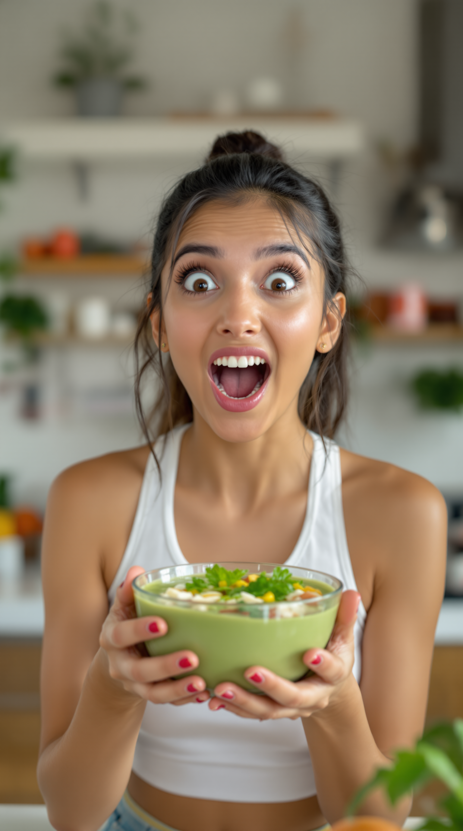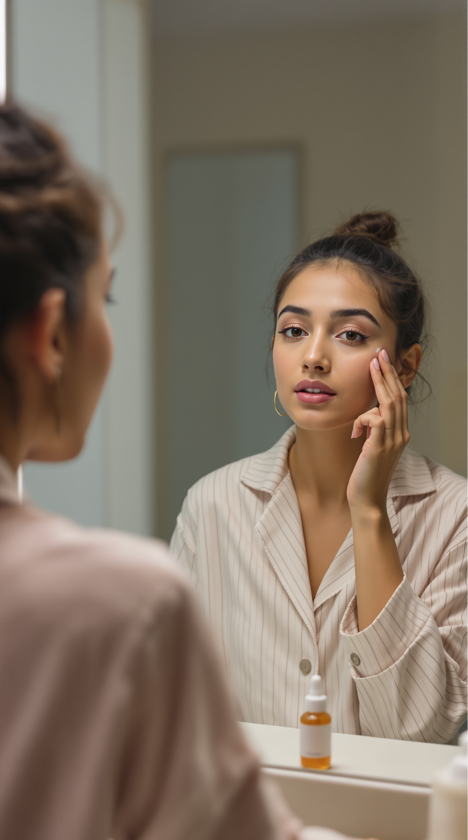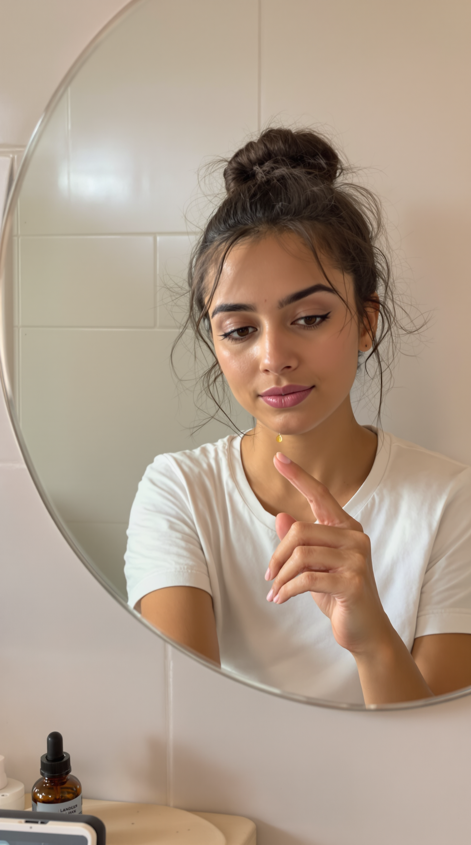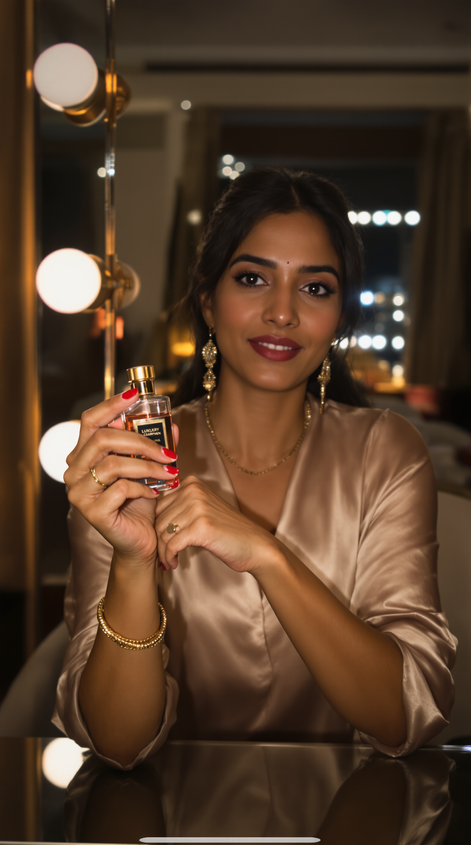 No templates, no forms. Just type what you want: "A woman holding my vitamin C serum, recommending it to camera in her bathroom." You can also upload your product photo.